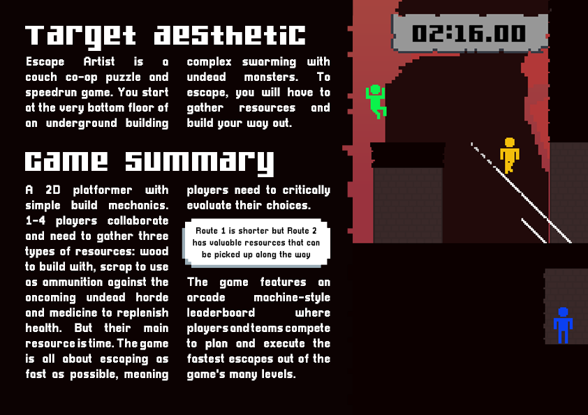 Escape Artist is a couch co-op puzzle and speedrun game. You start at the very bottom floor of an underground building complex swarming with undead monsters. To escape, you will have to gather resources and build your way out.